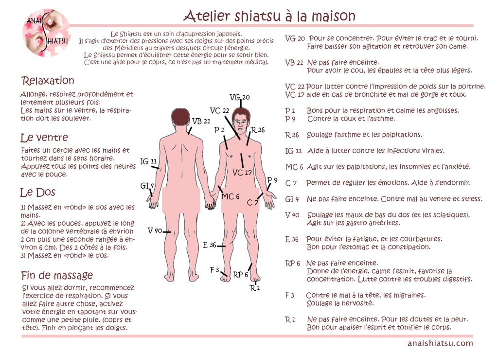 Pour palier, au moins en partie, à cette attente de shiatsu, je vous ai préparé un atelier à faire chez vous, seul ou accompagné. Vous pouvez aussi le faire aux enfants, à partir de deux ans.