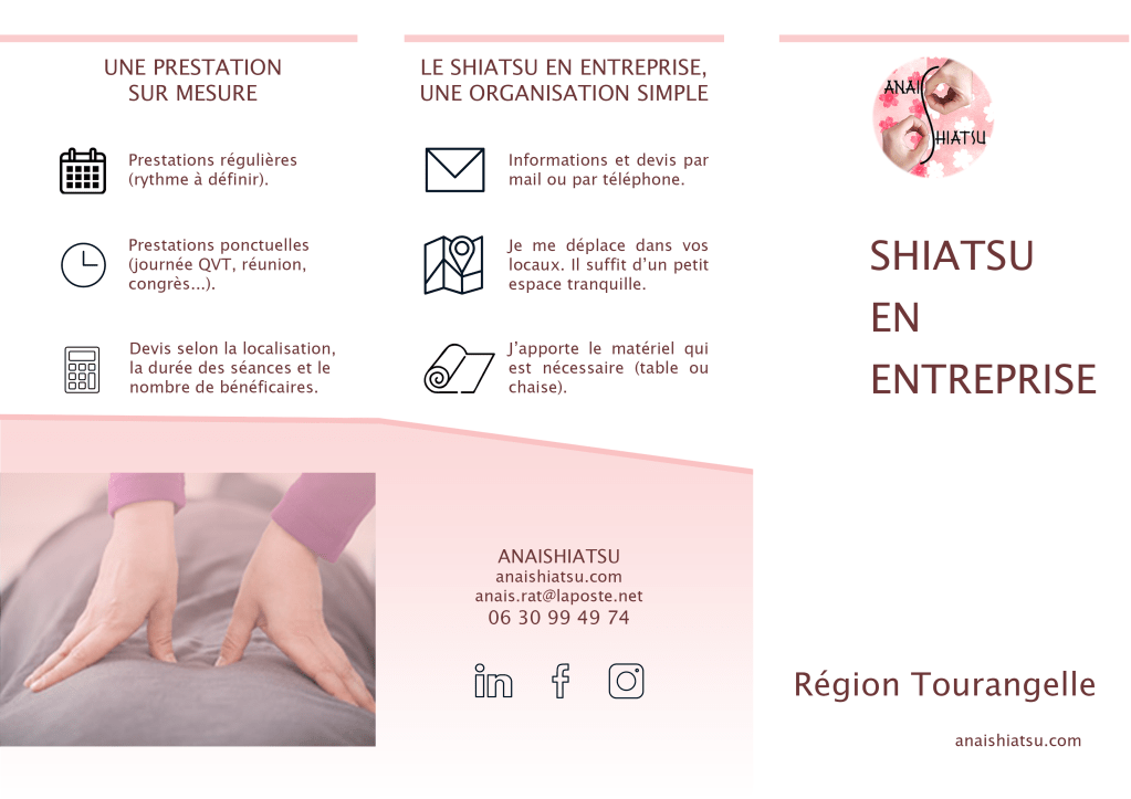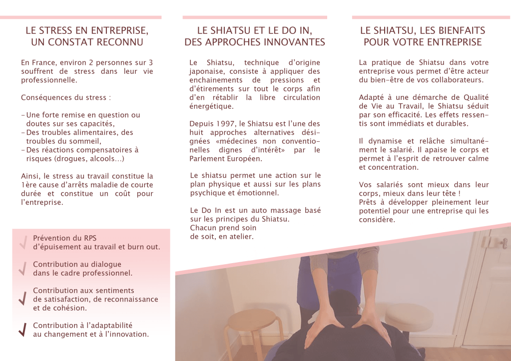 J’ai le plaisir de vous présenter la nouvelle plaquette Shiatsu en Entreprise. Et oui, les séances Shiatsu peuvent se faire sur votre lieu de travail ! Suivant le nombre d’inscrits, je peux venir seule, ou avec des collègues du Centre Energie et Bien-Etre, sur une demie journée ou une journée complète.