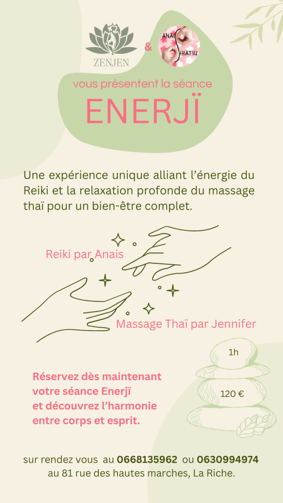 Venez explorer une alliance unique entre le Reiki et le massage thaï, où énergie et mouvement s’unissent pour restaurer l’harmonie de votre corps et de votre esprit. Cette séance complète allie l’apaisement des tensions physiques à une profonde relaxation intérieure, favorisant un équilibre durable. Un véritable voyage sensoriel pour relâcher, revitaliser et retrouver une sensation d’alignement naturel.